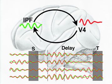Und tatsächlich: Die gemessene Spannung im visuellen Cortex begann in einem bestimmten Muster zu schwingen. Und genau in demselben Muster oszillierte auch der Bereich des Kurzzeitgedächtnisses. Die beiden Hirnareale hatten also über die Entfernung hinweg einen gemeinsamen Rhythmus gefunden, sie schwangen sozusagen im Takt. Eine solche synchrone Oszillation trat nur dann auf, wenn sich die Affen tatsächlich erinnern konnten. Gelang ihnen das nicht, dann war auch keine Synchronizität in den „Schwingungen“ zu sehen.