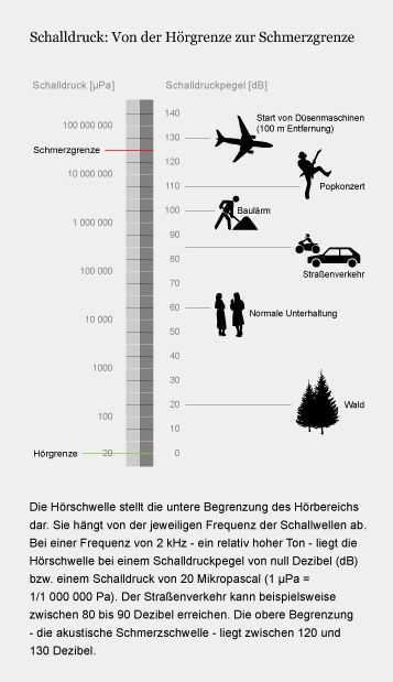 Die Schmerzschwelle für Lärm liegt zwischen 120 und 130 Dezibel (dBSPL). Dann hält der Mensch sich instinktiv die Ohren zu. Aber bereits eine Dauerbelastung von 85 Dezibel, etwa von einer stark befahrenen Straße, hinterlässt Spuren im Gehör. Krach, das haben Wissenschaftler herausgefunden, schadet zudem der Gesundheit. Bluthochdruck, Arteriosklerose, Herzinfarkte, Magengeschwüre – sie alle können auf das Konto anhaltender Lärmbelästigung gehen. So ist beispielsweise das Herzinfarktrisiko von Männern in lauteren Wohngebieten – mit einem Straßenlärm tagsüber von durchschnittlich mehr als 65 Dezibel – höher als das von Männern in ruhigeren Gegenden. Das zeigte eine Studie des Umweltbundesamtes von 2004. Und auch die Kleinsten sind bereits betroffen, wie die Mitarbeiter des Amtes in einer Studie aus dem Jahr 2009 erkannten: Kinder, deren Zimmer zu einer viel befahrenen Straße hinaus liegt, tendieren zu einem leicht erhöhten Blutdruck.