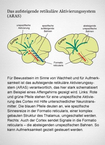 • Das aufsteigende retikuläre Aktivierungssystem (ARAS) unterhält zahlreiche Nervenverbindungen in die Großhirnrinde. Über diese Nervenfasern wird der Aktivierungsgrad des Gehirns beeinflusst.