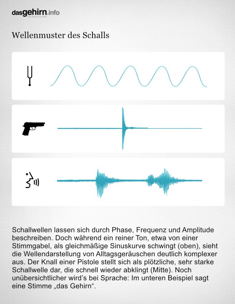 Even though sound always reaches us in the form of rapid fluctuations in air pressure and is therefore physically always more or less the same phenomenon, different types of sound are distinguished depending on their temporal progression. The simplest variant is a tone: a pure vibration of a single frequency with the waveform of a sine curve. A sound, on the other hand, consists of a tone plus harmonics, i.e., in addition to the fundamental tone (or tones), it also contains components with double, triple, or multiple frequencies. The waveform is thus more complex than that of a tone, but still regular: it repeats itself periodically. Depending on the ratio in which the overtones are composed, a sound can resemble a flute, violin, organ, and so on. If the waveform is not periodic but completely irregular, it is referred to as a noise. This includes any form of noise, but also the sound that leaves the mouth when speaking. Finally, there is the bang as a special form of noise. It is characterized by a very sudden increase and rapid decrease in amplitude.